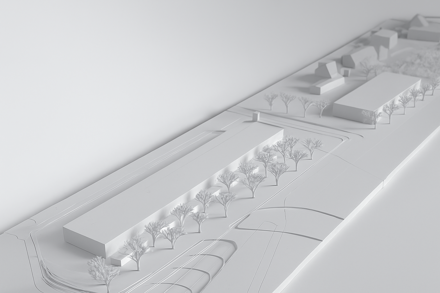 Die Stirnseite des Gebäudes wird zur überhöhten Übungsfassade, die sich einer neuen Festhalle und zugleich dem gewachsenen Ortszentrum zuwendet.  An dieser Ecke sollen auch die zentrale Zufahrt und der Hauptzugang des Gebäudes liegen. Der Salz-Silo trägt seinen Teil zur räumlichen Dramaturgie einer öffentlichen Infrastruktur bei.