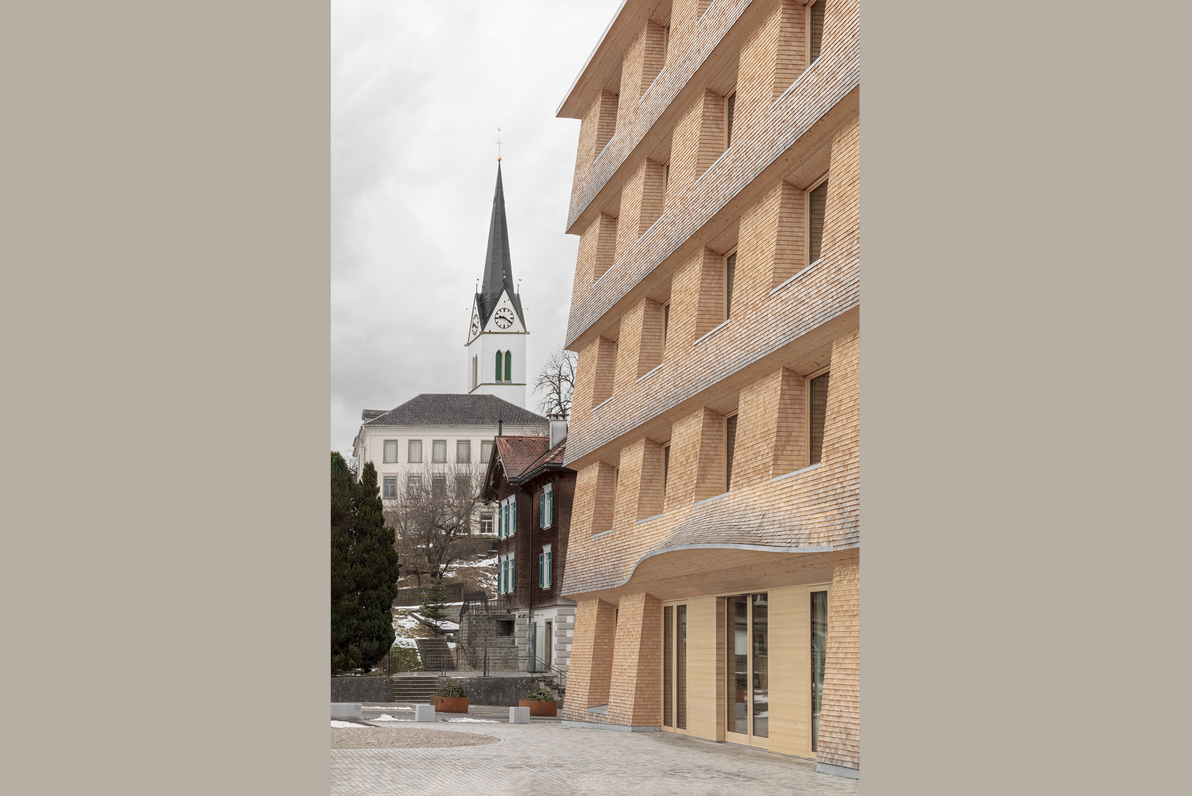 Die Höhe ist mit über fünf Geschossen herausfordernd, aber die zentrale Position im Ort und die Tatsache, dass die Kirche noch deutlich höher steht, lassen die Höhe richtig erscheinen. Zum Gemeindeamt geht das neue Haus eher auf Distanz, es rückt dicht an die L-200 heran.