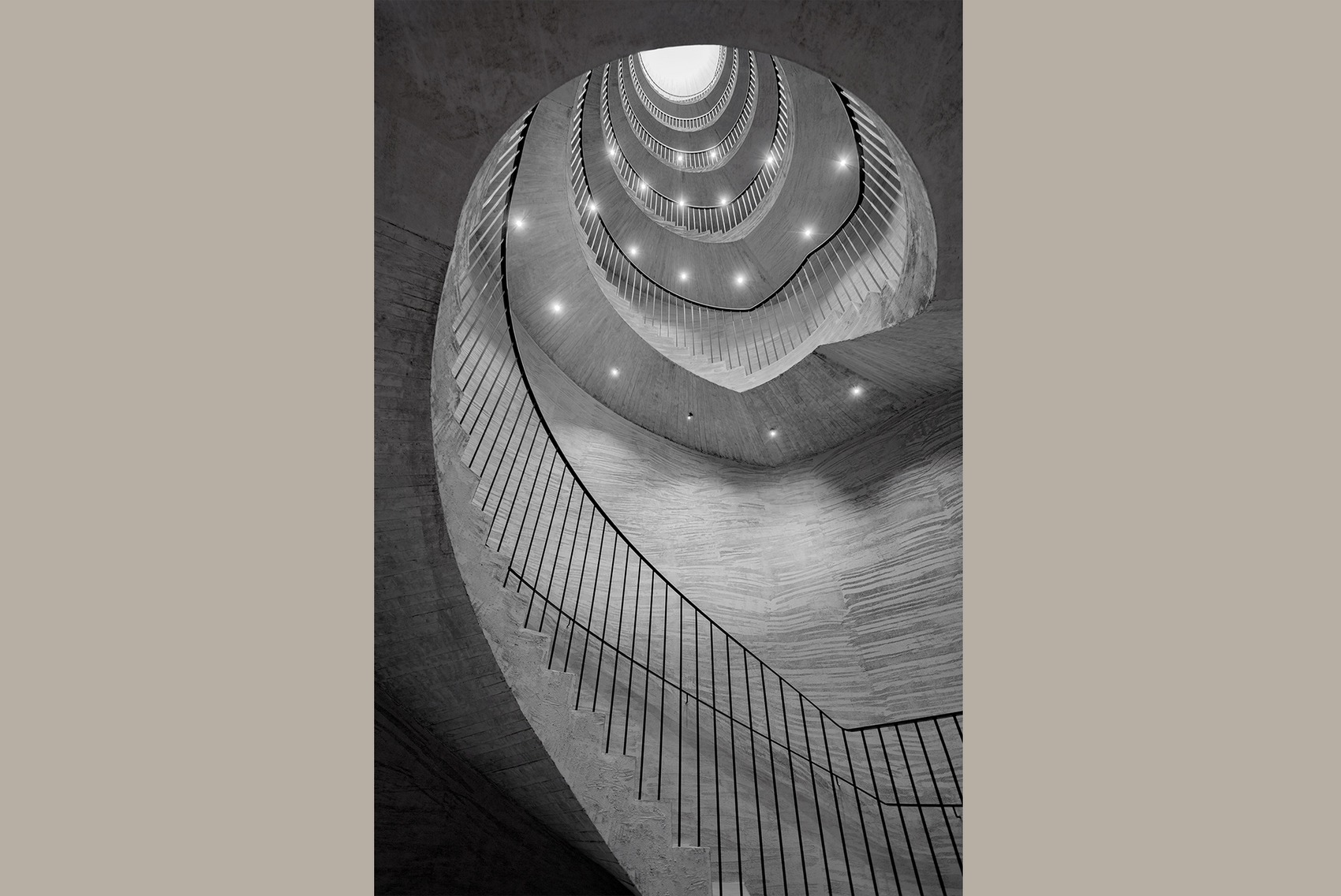 Ein Blick nach oben, der in einer Höhe von 27 Metern durch ein kreisrundes und glasklares Oberlicht in den Himmel geöffnet wird. Oberlicht und Stiegenauge haben einen Durchmesser von ca. 3 Metern, dennoch entsteht ein monumentaler Raum mit einer Vielfalt von Blickbeziehungen.